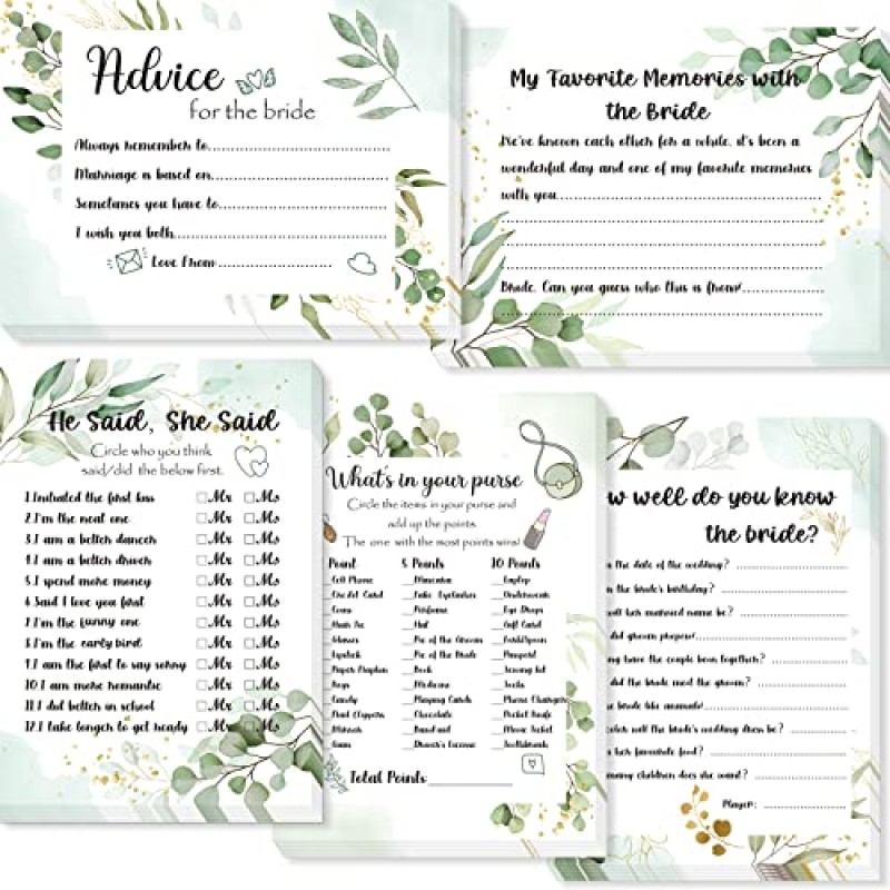 Celebrate your hen do with this delightful 50-piece card game set featuring five fun styles including 'What's in Your Purse', 'He Said She Said', 'How Well Do You Know The Bride?', 'My Favourite Memories With The Bride', and 'Advice for the Bride'. Each card measures a handy 180 by 130 mm, just the right size for easy handling and reading throughout your celebrations. The cards boast elegant eucalyptus leaf patterns, adding a touch of sophistication and sparkle to your party décor. Whether gathered around a table or mingling, this game set encourages laughter, bonding, and memorable moments amongst friends. Made from quality paper with clear, lasting prints, these cards are sturdy enough to keep your hen night buzzing with fun. They also make a thoughtful and practical gift to enrich any bridal shower, rehearsal dinner, or engagement party, ensuring your hen celebration feels extra special and beautifully styled.