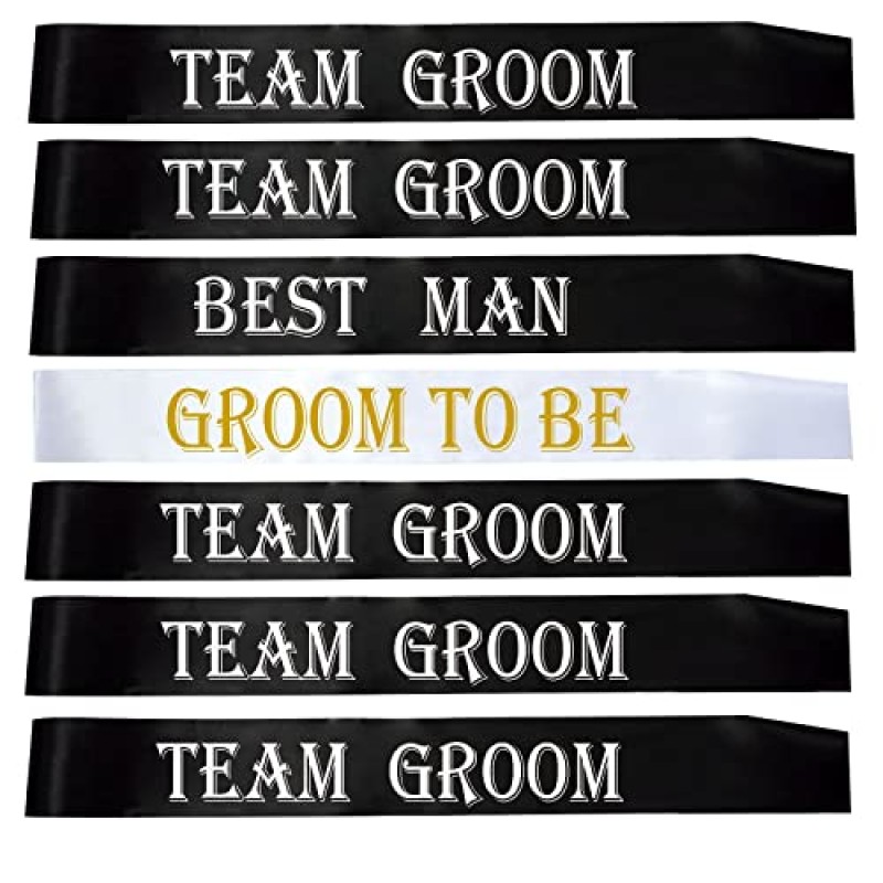 - Set includes 1 ‘GROOM TO BE’, 1 ‘BEST MAN’, and 5 ‘TEAM GROOM’ sashes