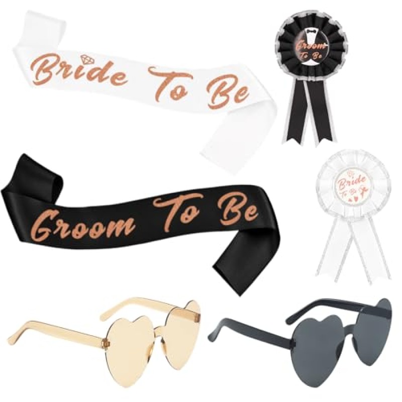 Celebrate the bride-to-be in style with this fabulous sash set, perfect for uniting her squad and adding a touch of sparkle to the hen do festivities. The set includes a stunning white-gold "Bride to Be" sash to mark the guest of honour, alongside a chic black-gold "Team Bride" sash that perfectly identifies the bridesmaids and closest friends. To add a playful, photo-ready flair, the package also features two heart-shaped sunglasses in pink and black, ensuring the group shines brightly in every snapshot. Plus, personalised badges add a delightful custom touch to the celebration, making it even more memorable.