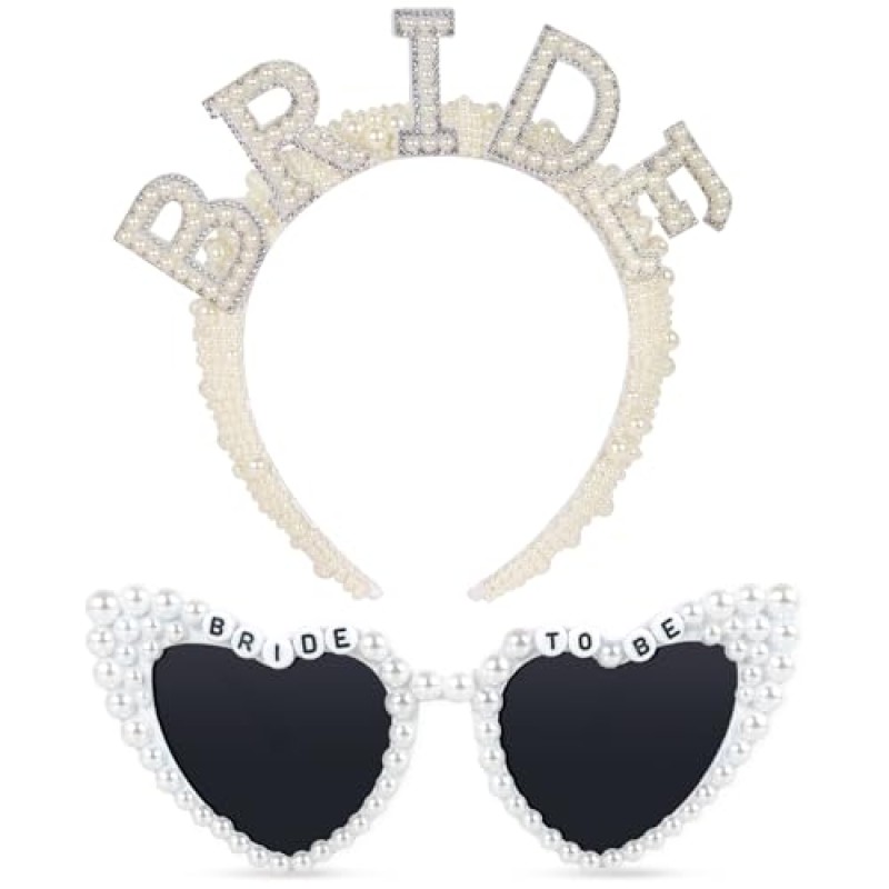 - Includes 1 pearl 'BRIDE' headband and 1 pair of heart-shaped 'BRIDE TO BE' pearl sunglasses