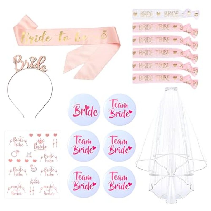- Contains 1 satin bride to be sash, 1 double-layer gauze veil, 1 wedding bracelet, 4 team bride bracelets, 1 bride headband, 6 bride badges, and 1 temporary tattoos sheet