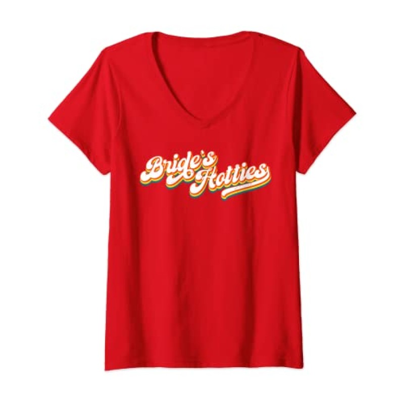 Celebrate the bride-to-be in style with this charming 'Bride's Hotties' retro V-neck T-shirt, designed especially for her closest friends, including the maid of honour and bridesmaids. Featuring a playful 60s/70s distressed look, this classic fit tee brings a fun vintage vibe to any hen do celebration. Lightweight and comfortable, it’s perfect for those lively party nights and group photos, creating a cohesive and memorable look among the bride’s team. Pair it with the matching 'Hot Bride' shirt for the bride-to-be to complete the set and make your hen do truly unforgettable. Whether out on the town or enjoying a cosy get-together, these tees add an extra sparkle of togetherness and style to your celebration.