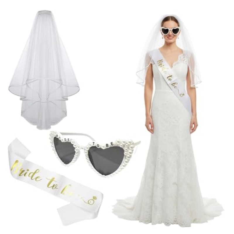 - Includes 1 white bridal veil with sewn-in plastic comb, 1 pre-sewn sash, and 1 heart-shaped sunglasses