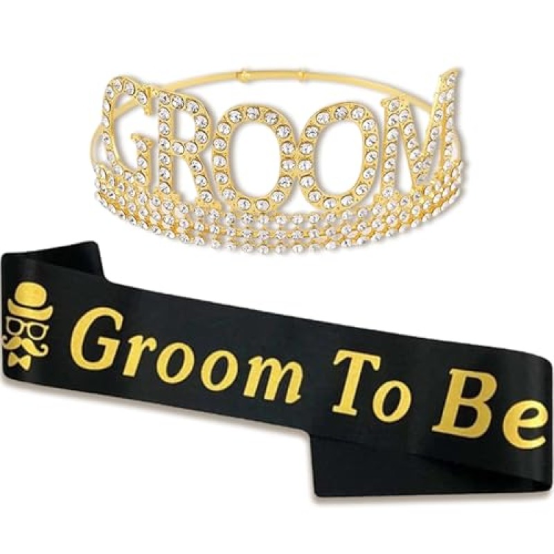 - Set includes 1 crown with simulated diamonds and 1 groom-to-be sash.