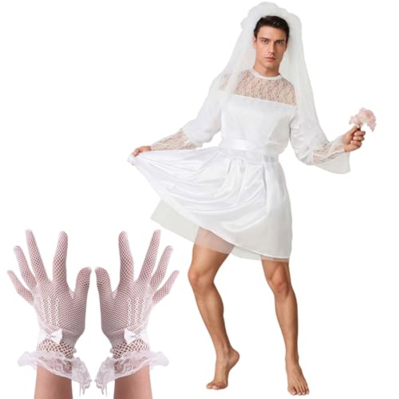 Step into the spotlight and add a splash of playful glamour to your celebration with this deluxe men's lace wedding dress costume. Perfect for hen dos, stag parties, Halloween, or any fancy dress occasion, this striking outfit combines elegance with a cheeky twist. Crafted from high-quality polyester, the costume includes a flowing white skirt, delicate lace gloves, and a matching veil that together create a memorable look that’s both durable and comfortable.