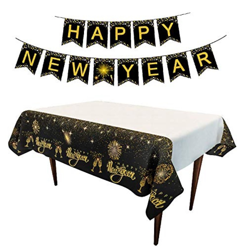 Dusenly Gold Glitter New Year Celebration Banner & Table Cover