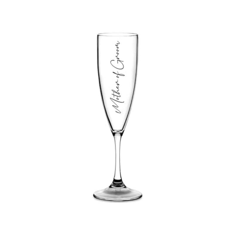 Share sparkling moments with this elegant champagne flute, perfect for hen do celebrations and wedding parties. Crafted from premium clear BPA-free plastic, this flute offers the stylish look of glass with the practical benefits of lightweight durability—ideal for lively gatherings. With a tall, slender design measuring 202mm high and 55mm wide, it holds 175ml of your favourite bubbly, whether prosecco, champagne, or cocktails. The chic black lettering featuring titles like 'Mother of Groom' adds a personalised touch, making group photos shimmer with style and unity. Whether you're toasting at a pre-wedding brunch, party, or chill-out with friends, these flutes effortlessly combine sophistication with fun, ensuring the bride's closest circle can celebrate in sparkling harmony.
