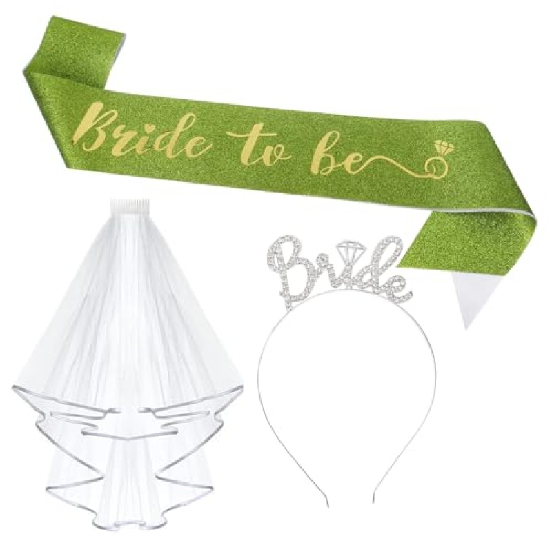- Includes 1 satin 'Bride to Be' sash, 1 white veil with comb, and 1 shimmering metal headband
