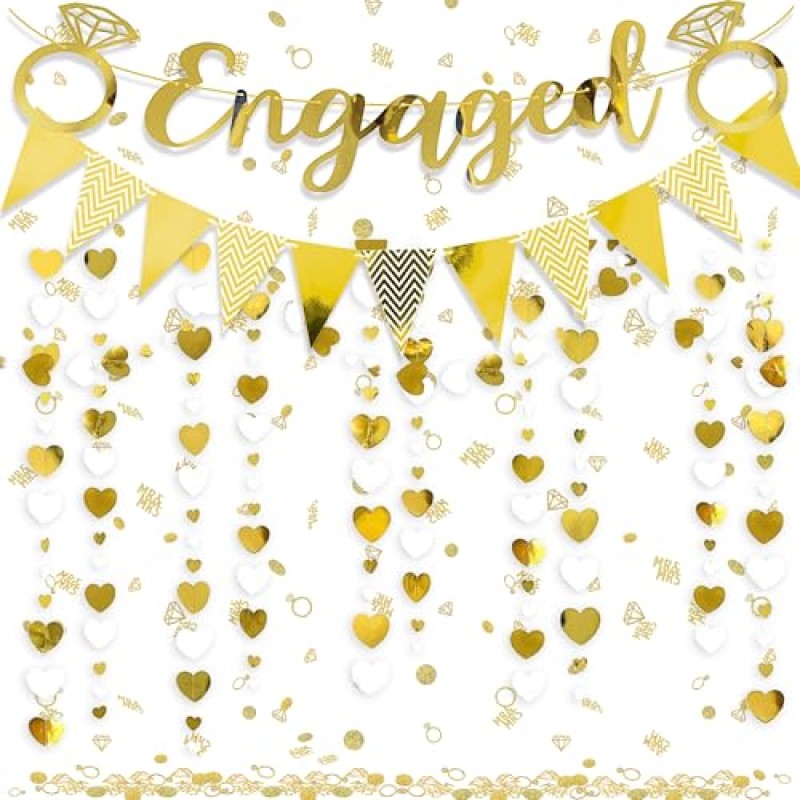 - Includes 1 gold foil 'engaged' banner, 1 triangular pull flag, 1 white and gold heart streamer (4 metres), and 220 gold table confetti pieces.