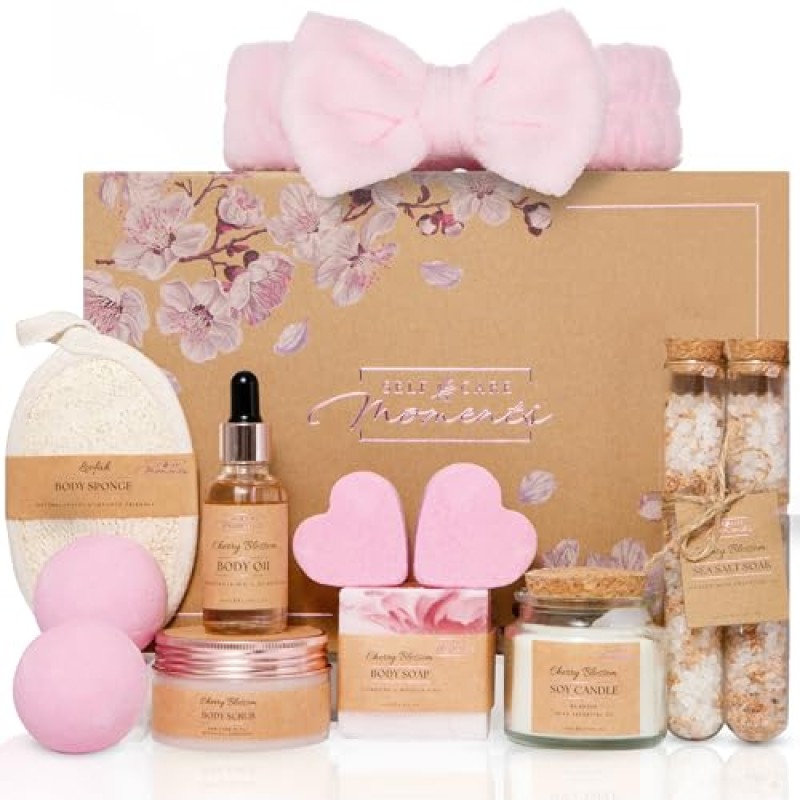 - Includes 12 delightful spa items such as body oil, bath salts, bath bombs, candle, body scrub, soap, shower steamer, loofah, and spa headband