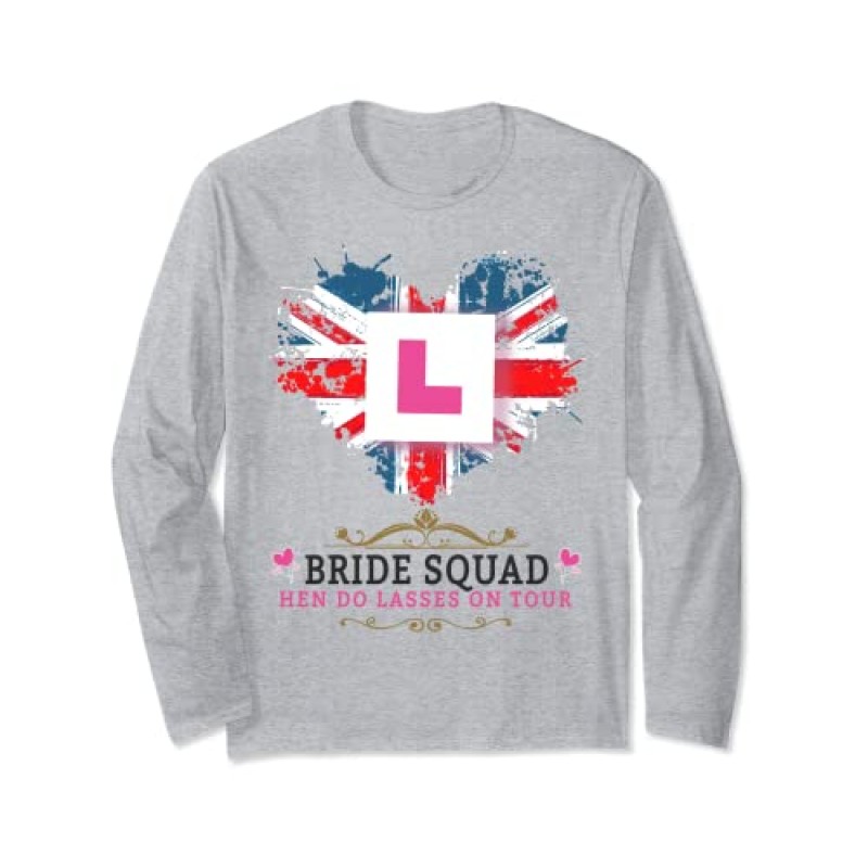 Celebrate your hen do in style with these matching long sleeve t-shirts, designed especially for the bride squad and her lovely bridesmaids. Perfect for making your group stand out on a fun-packed UK hen weekend in places like Bournemouth, Blackpool, or Bristol, these tees add a touch of unity and sparkle to your celebrations. Featuring a classy Union Jack design, they're a charming nod to British spirit and a brilliant conversation starter during hen party games or nights out.