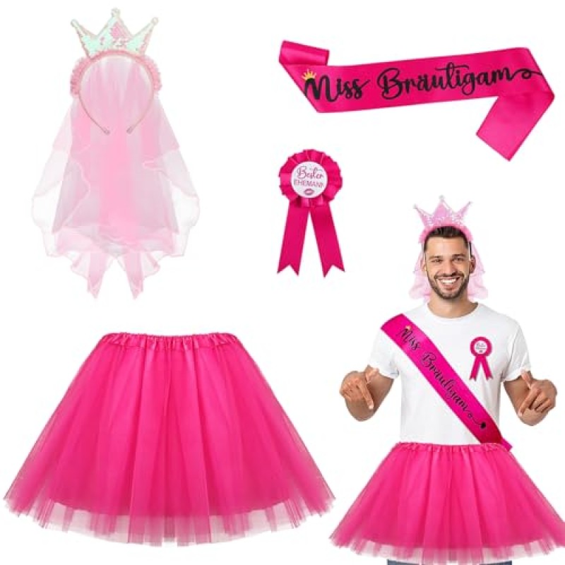 Celebrate the groom's last night of freedom in style with this playful men's hen party outfit set. Designed to bring a splash of fun and sparkle, the set includes a charming pink veil crown headband, a bold sash reading "Miss Groom," a flower-shaped best husband badge, and a flirty pink tulle skirt. Crafted from high-quality satin and durable polyester materials, each piece balances comfort and standout style, making the groom the heart of the hen do festivities.