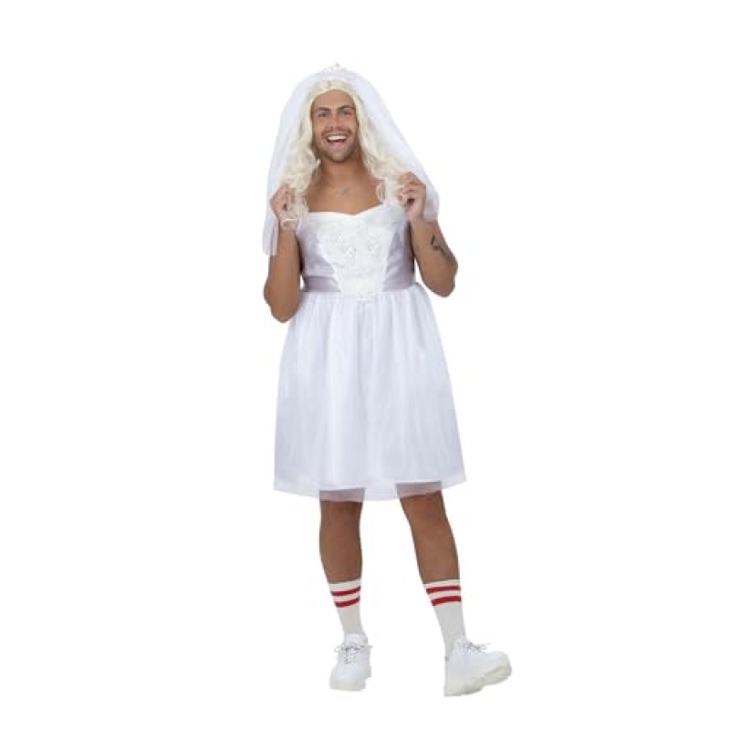 Bring a burst of laughter and light-hearted fun to any hen do or stag party with this fabulous men's Bride Costume. Featuring a classic white wedding dress complete with an embroidered lace chest panel, this outfit is perfectly paired with a bridal veil and a sparkling tiara to complete the look. It’s designed in an extra-large size, comfortably fitting chest sizes 46"-48" and waist 40"-42", making it a great fit for many partygoers.