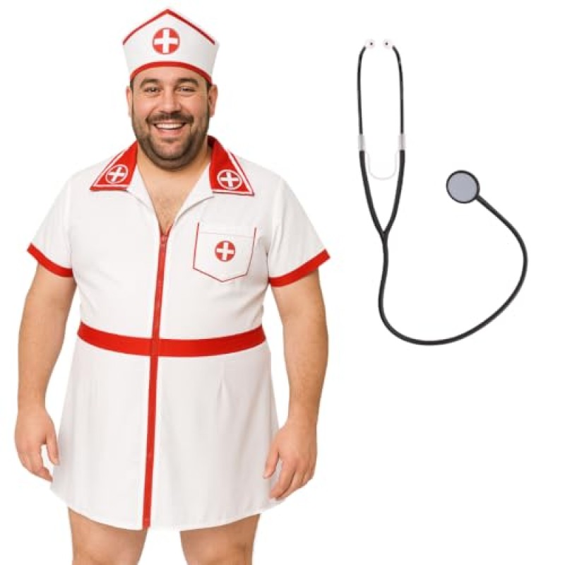 - Includes short white nurse-style dress with red trim, nurse hat, and stethoscope