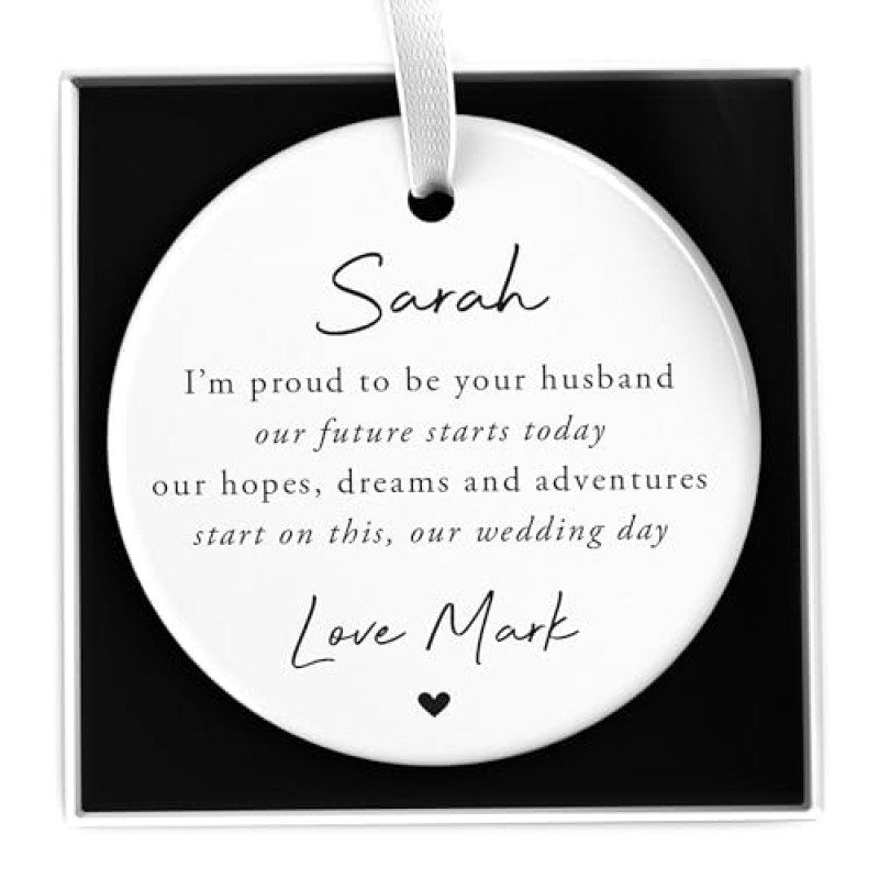 Presented in a luxurious white gift box lined with black velvet and elegantly stamped with a gold foiled message, this gift feels as special as the occasion itself. It includes a selection of satin ribbons in red, white, and silver, allowing your bride to easily hang and display her ornament wherever she wishes. Handmade with care in the UK, this personalised gift is a thoughtful and lasting tribute to your love, ideal for gifting on the wedding morning to add a heartfelt sparkle to the celebrations.