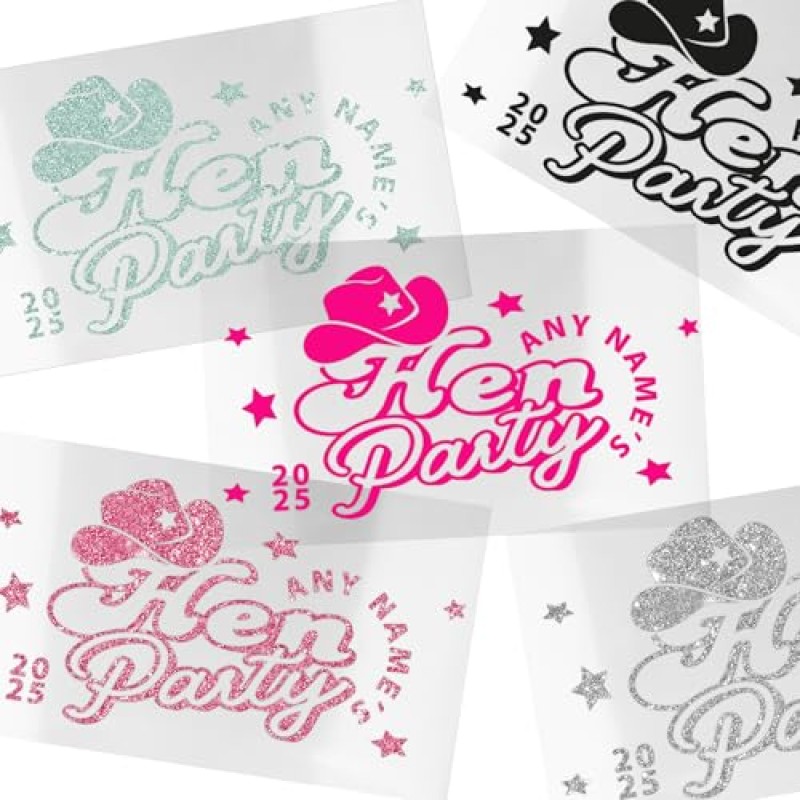 Add a splash of country charm to your hen do with this personalised cowboy hat iron-on transfer. Designed to bring the bride’s name and party year to life, this playful Western-style transfer is ideal for customised t-shirts that make your celebration truly memorable. Whether you’re planning a cowboy-themed gathering or simply want matching tees for the whole bridal squad, this premium heat transfer vinyl offers a fun and effortless way to create unique outfits.