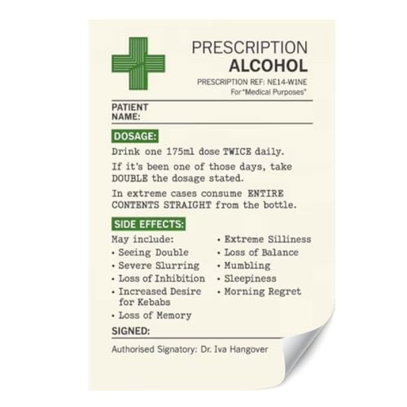 Add a cheeky twist to your hen do celebrations with this Personalised Prescription Wine Label, transforming any ordinary bottle into a hilarious, themed gag gift. Designed to look precisely like a real medical prescription slip, it playfully features dosage instructions, side effects, and a witty layout sure to spark laughter and create memorable moments.