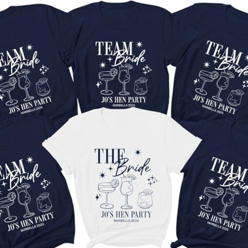 - Bride’s shirt is white with navy print; hen party shirts are navy with white print