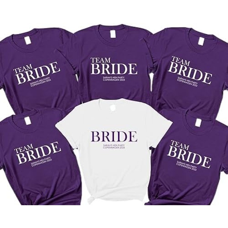 The shirts feature vibrant garment vinyl text, adding a touch of fun and identity to your celebration. While the bride’s purple text may appear a little softer than the mock-ups, it complements the group perfectly without overpowering. Ideal for group photos, day-out adventures, or relaxed party moments, these tees bring cohesion and a festive spirit to your hen do.