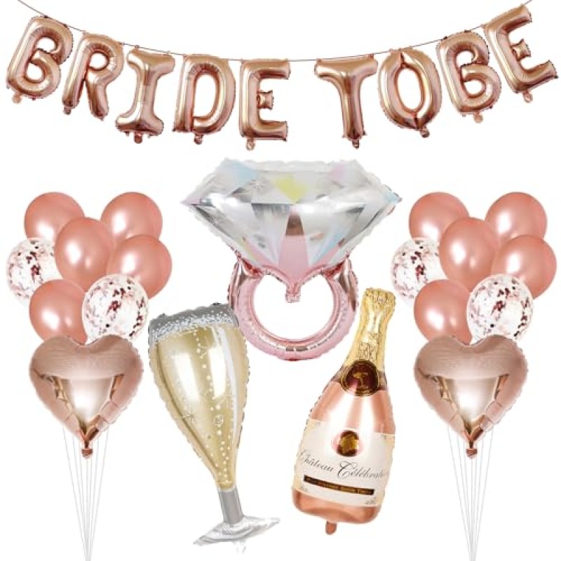 - Includes 28 pieces: foil "BRIDE TO BE" letter balloons, diamond, champagne bottle, champagne glass, confetti, rose gold latex, and heart-shaped balloons